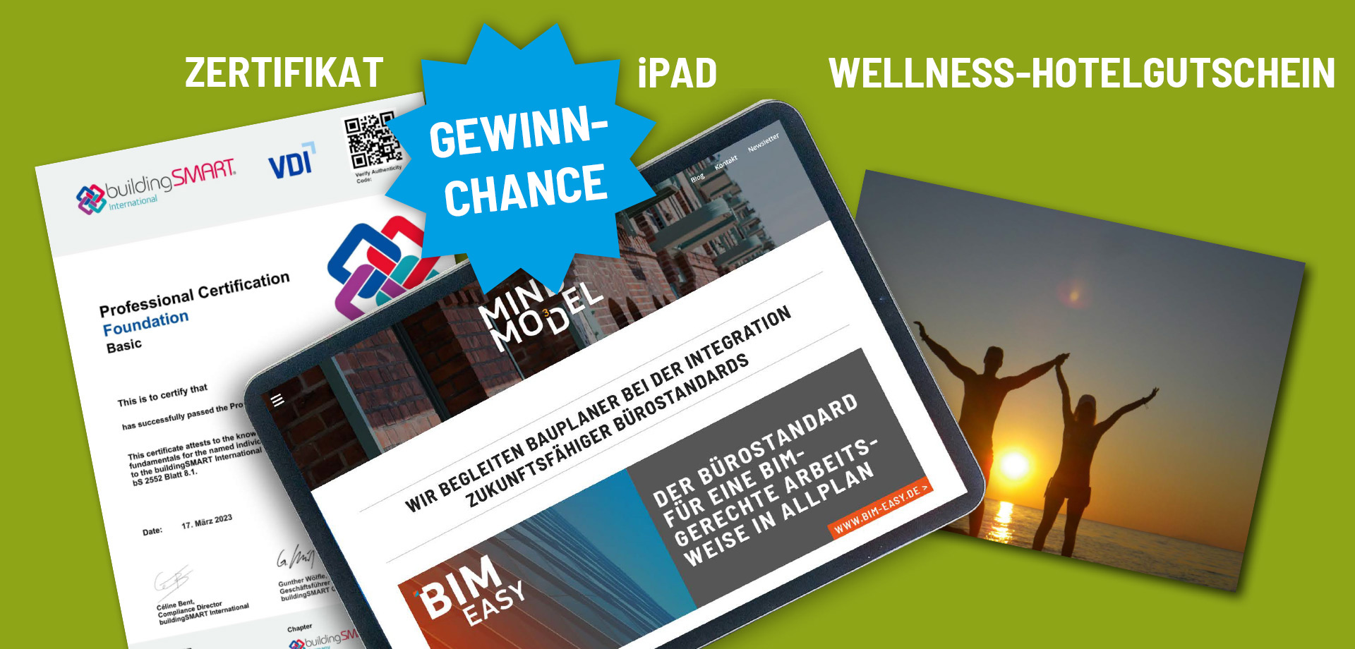 zu Deinem Wissen in ALLPLAN gegenüber dem durchschnittlichen ALLPLAN-User. Darüber hinaus nimmst automatisch an einer Verlosung Teil. Zu gewinnen gibt es wahlweise einen Gutschein für eine BIM-Zertifizierung, ein Apple iPad oder einen Wellness-Gutschein. In jedem Fall erhälst Du eine Teilnahmebescheinigung mit einer Einordnung Deines ALLPLAN-Kenntnisstands.